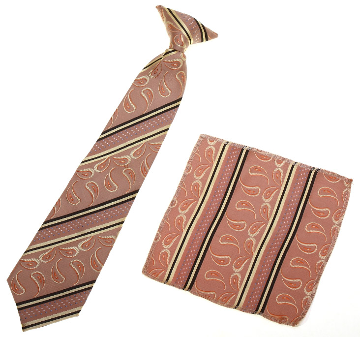 Boys dark salmon colour patterned tie. Length 14"/35.5cm (including the knot). Suitable from 12 year to 16 years. Easy Clip-on design (back of tie has a clip to clip onto the front collar)
