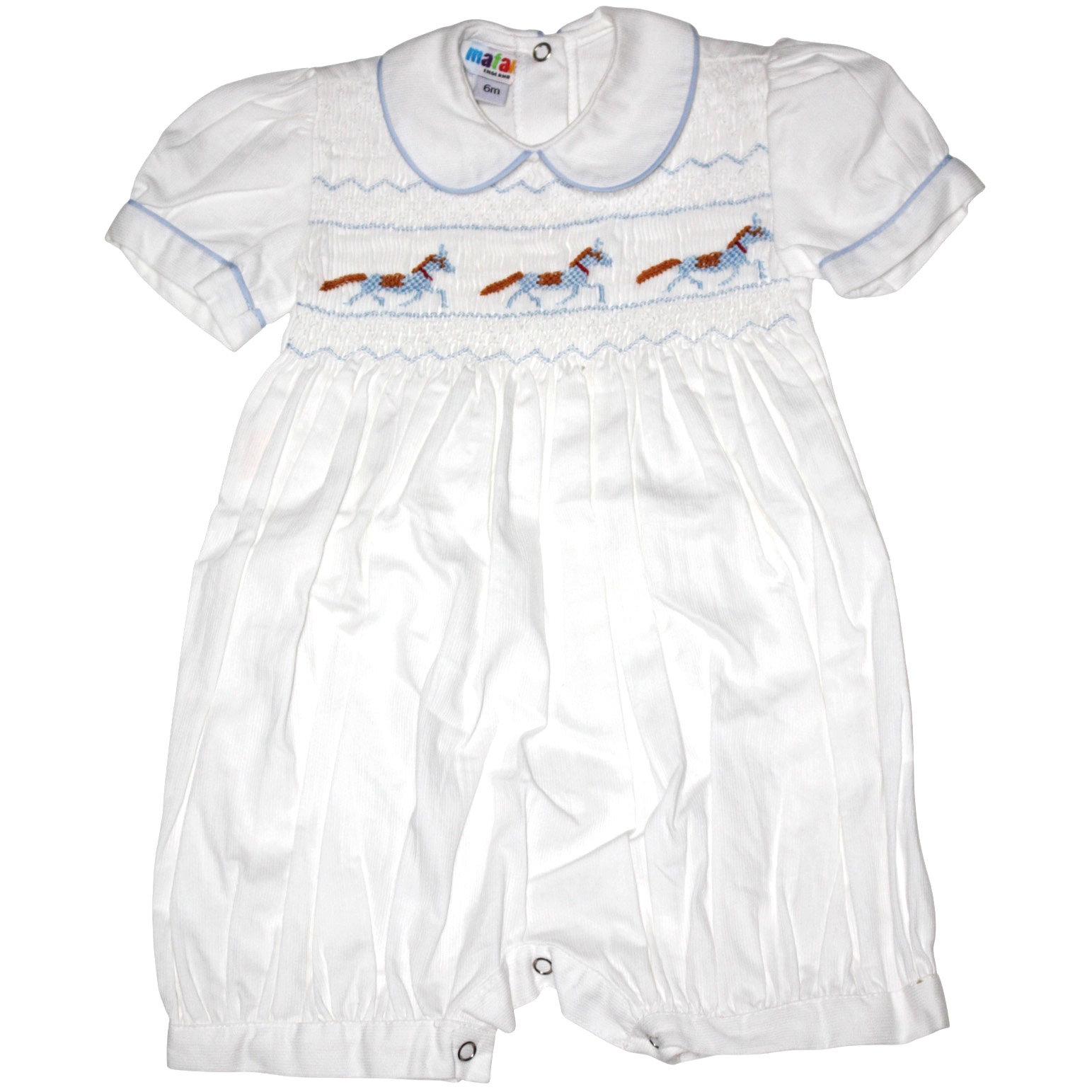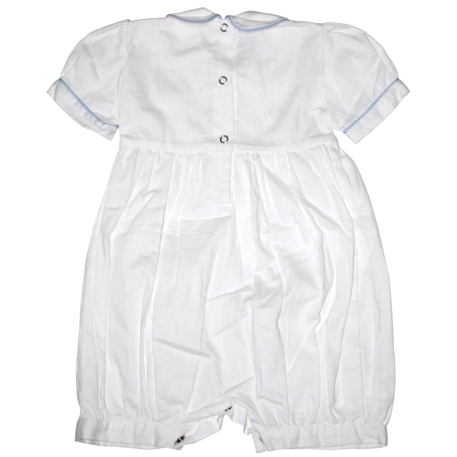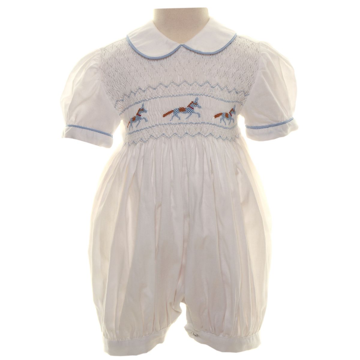 Hand smocked baby'straditional romper with horse embroideries. Suitable for both boys and girls. White Peter Pan collars with blue trim and blue embroideries. 100% cotton. Buttoned at rear and around groin.