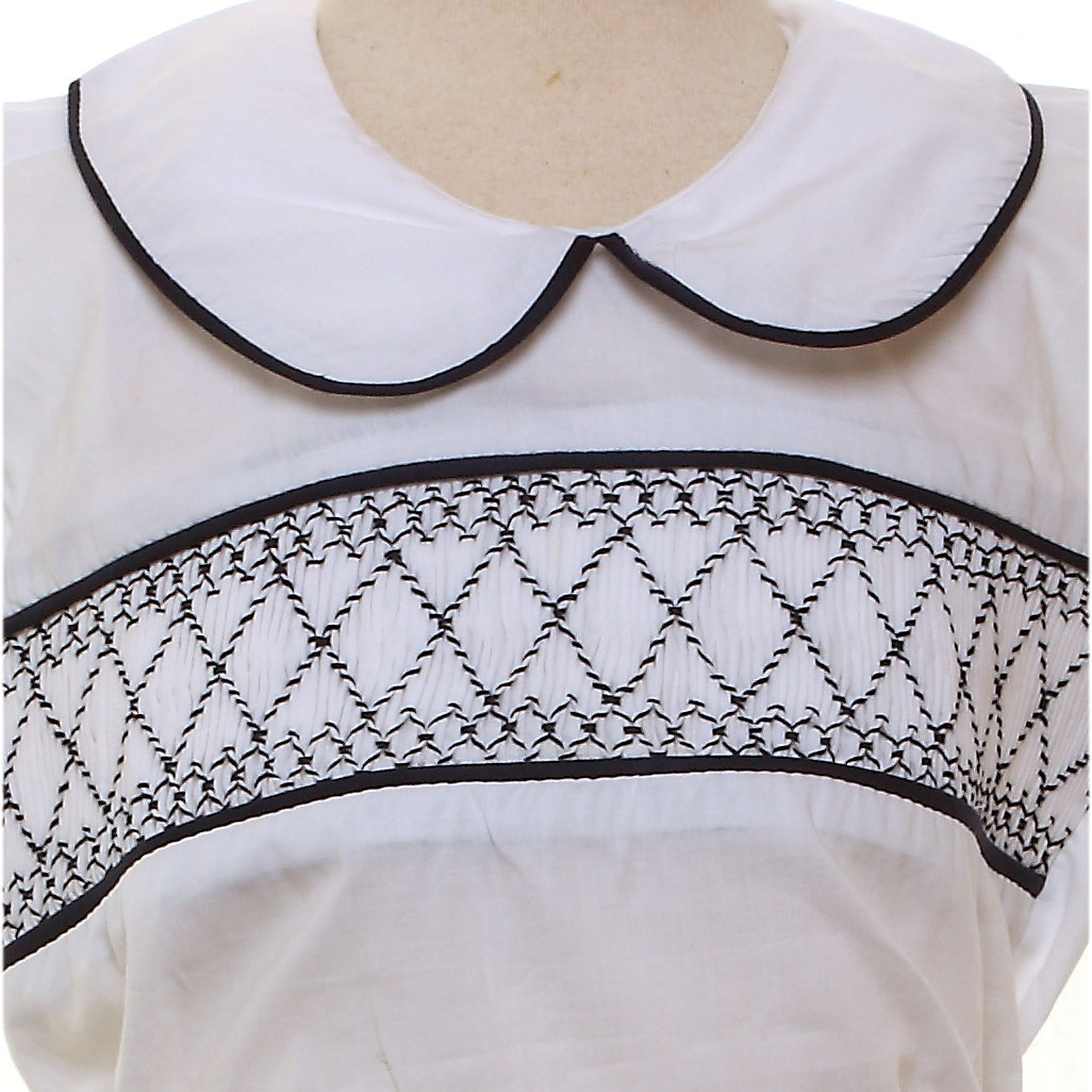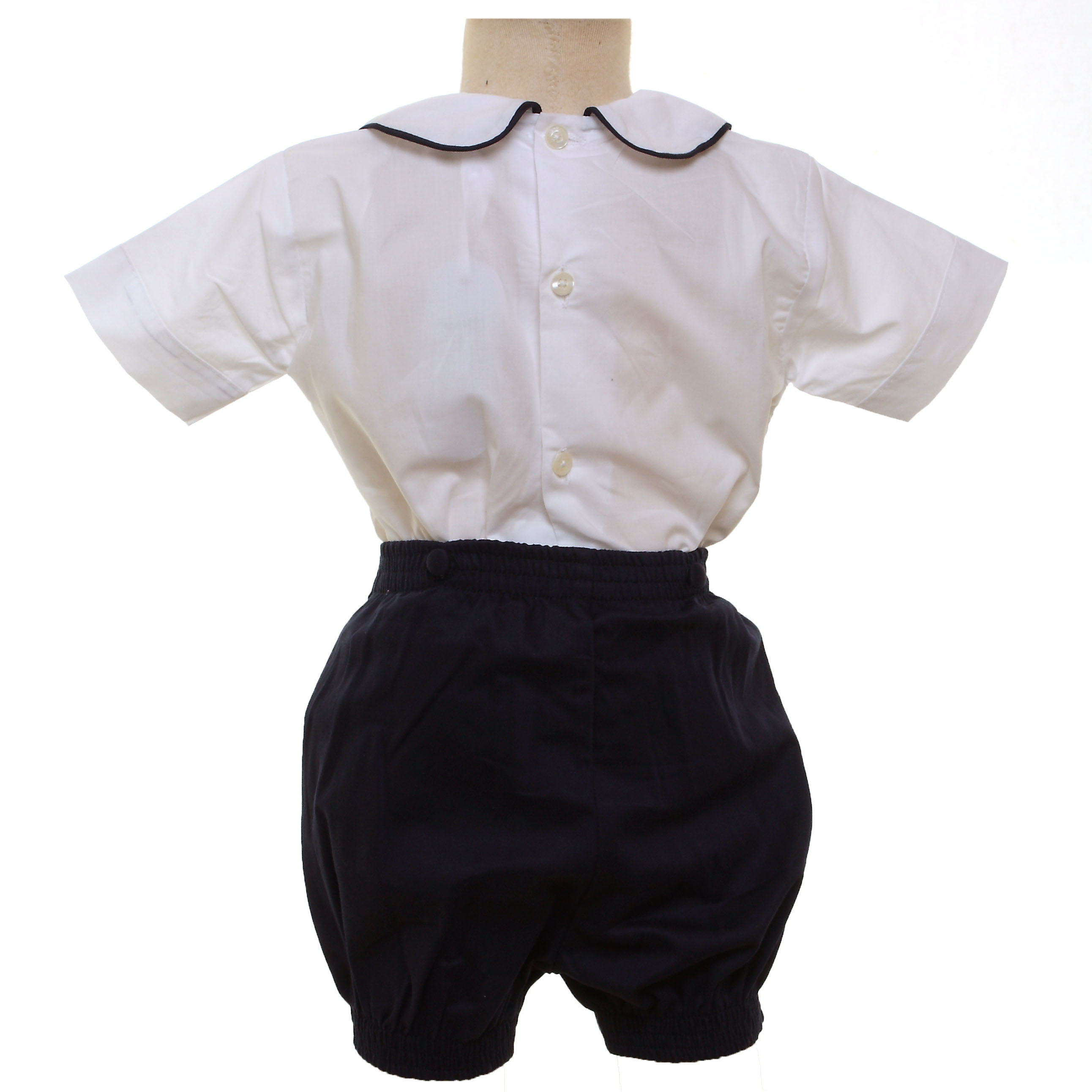 Traditional baby boys romper with white smocked top and navy shorts. The top is buttoned to the shorts by 2 front buttons and 2 back buttons.