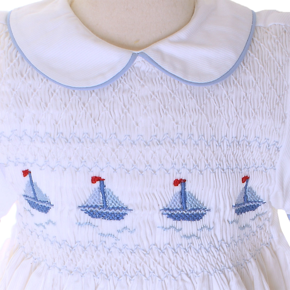 Hand smocked baby boys traditional romper with blue sailboat embroideries. White Peter Pan collars with blue trim. 100% cotton. Buttoned at rear and around groin.