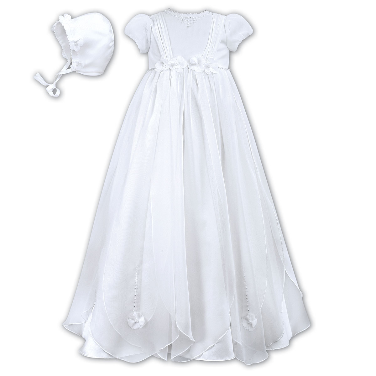 Beautiful white Christening robe / Baptism robe by Sarah Louise. Decorated by flowers and beads. Fully lined with multi layers of net.