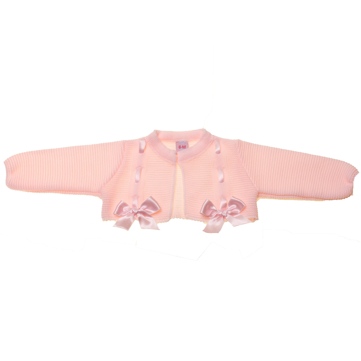 Nice and soft baby girls pink bolero, decorated by matching colour pink ribbons and pink bows. Made in Spain.