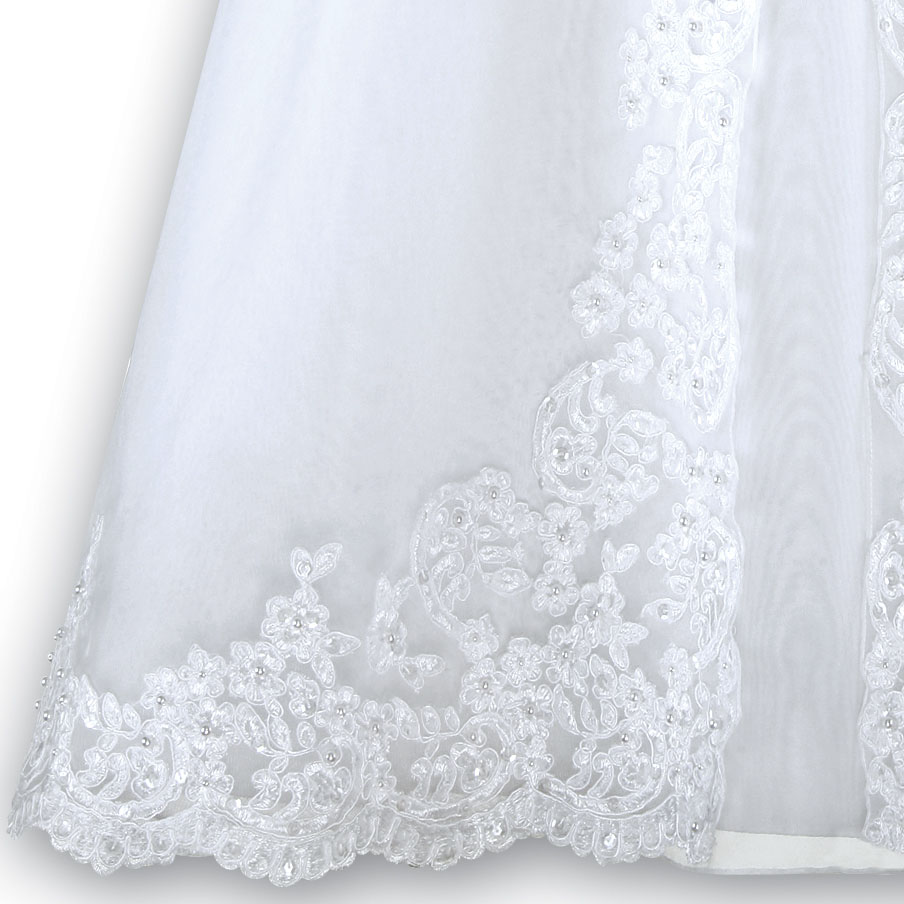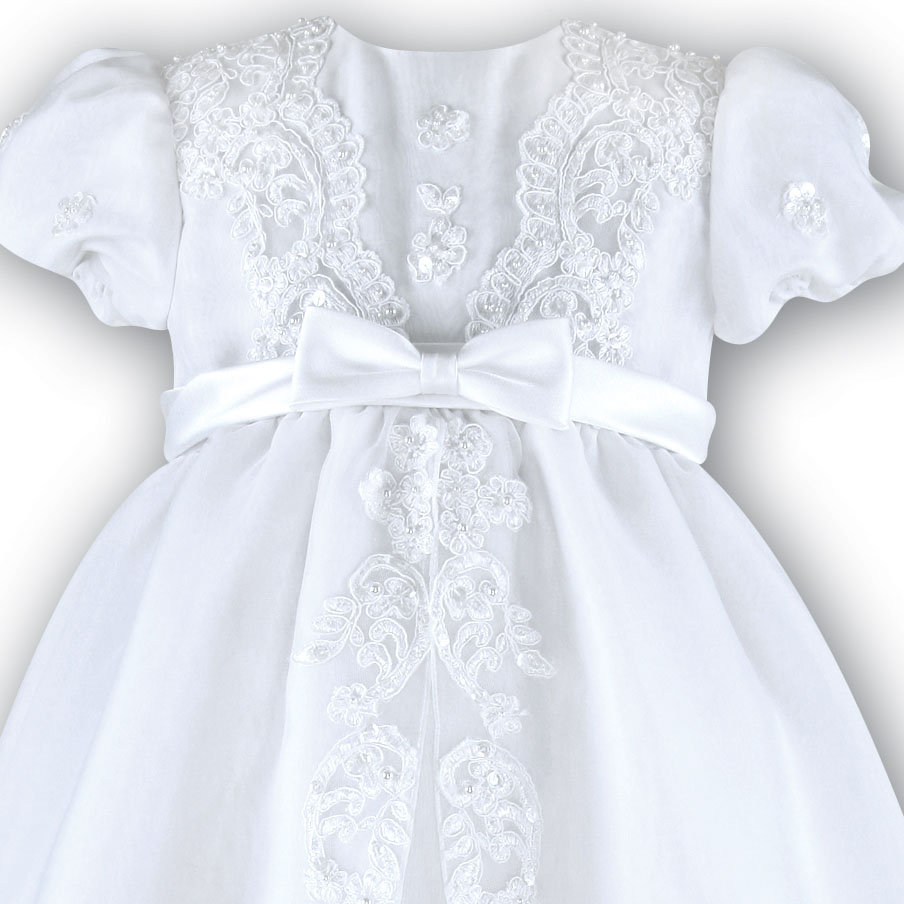 Beautifully decorated white Christening robe / Baptism robe by Sarah Louise with flowers, beads and sequins decorated on net over bodice, on sleeves and on bonnet.