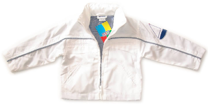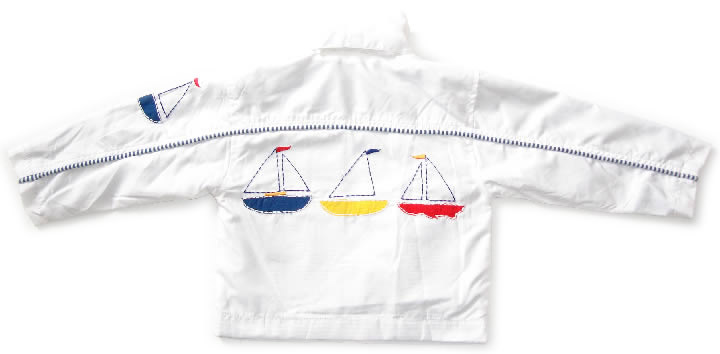 PEX baby and toddler boys thin wind proof nautical style jacket with rollup hidden hood. Outter layer 100% polyester. Inner linning 100% cotton. Embroidered ship patterns.