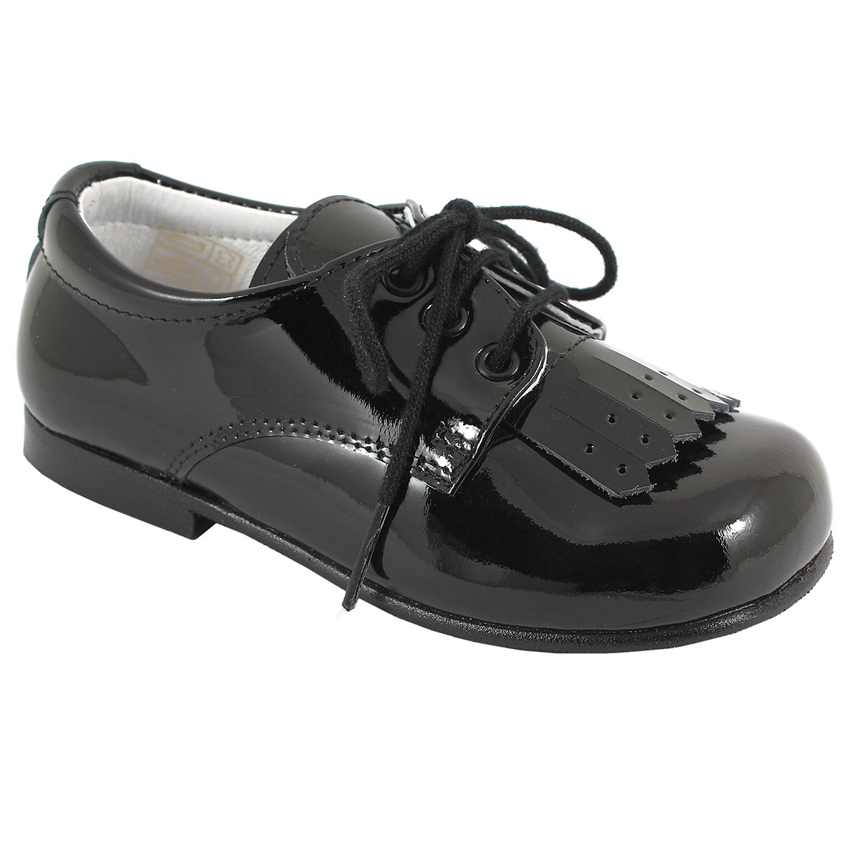High-quality boys' black patent shoes adorned with a fringe: