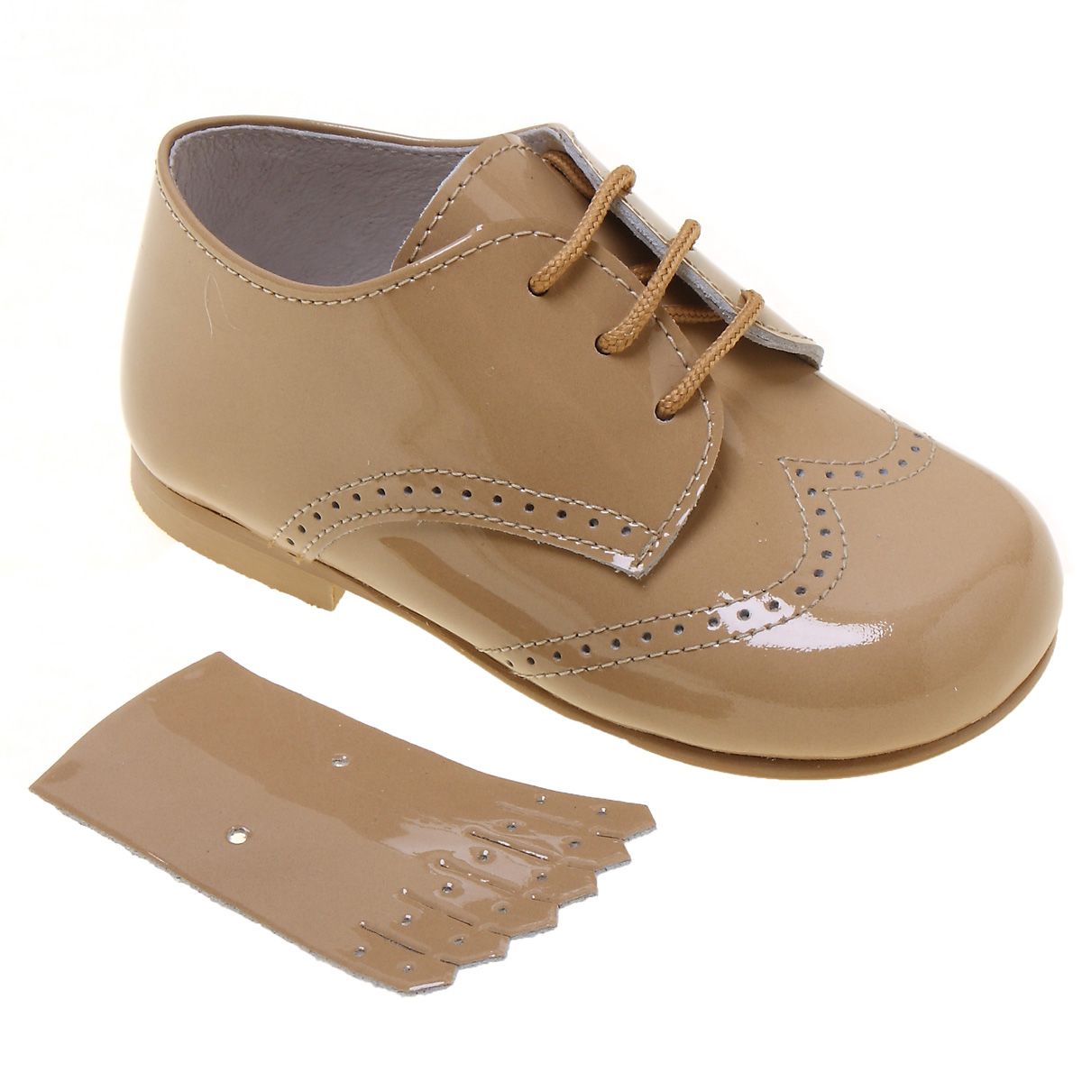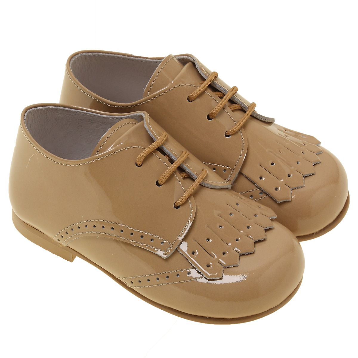 Lovely top quality boys caramel brown patent shoes decorated by a fringe