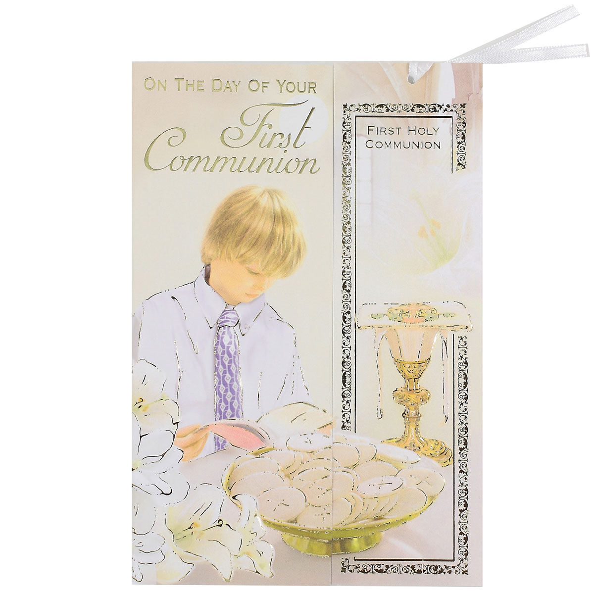 The right side of the card is detachable and turns into a bookmarker. Back of the bookmarker contains a Communion Prayer.