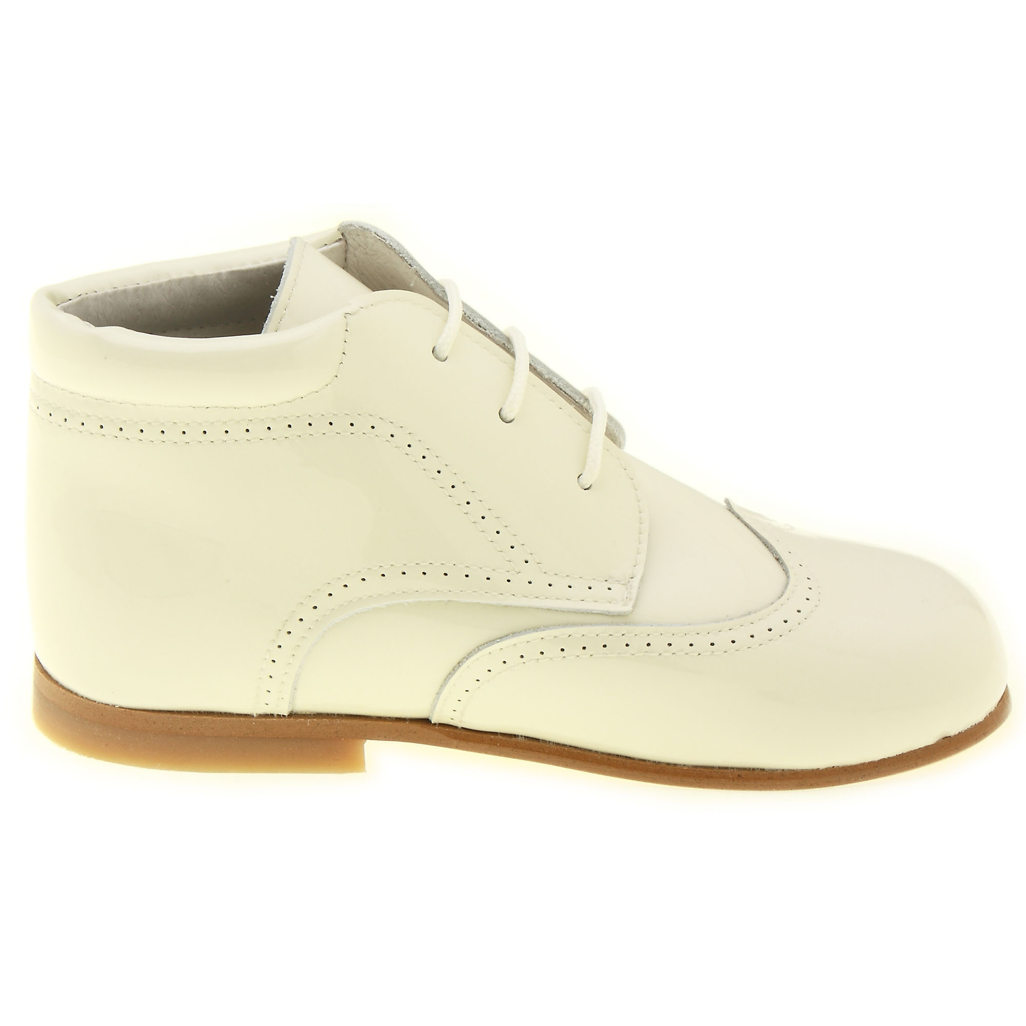 Spanish made baby and toddler boys ivory patent classic boots. 100% leather. Man made sole. Lace fastening.