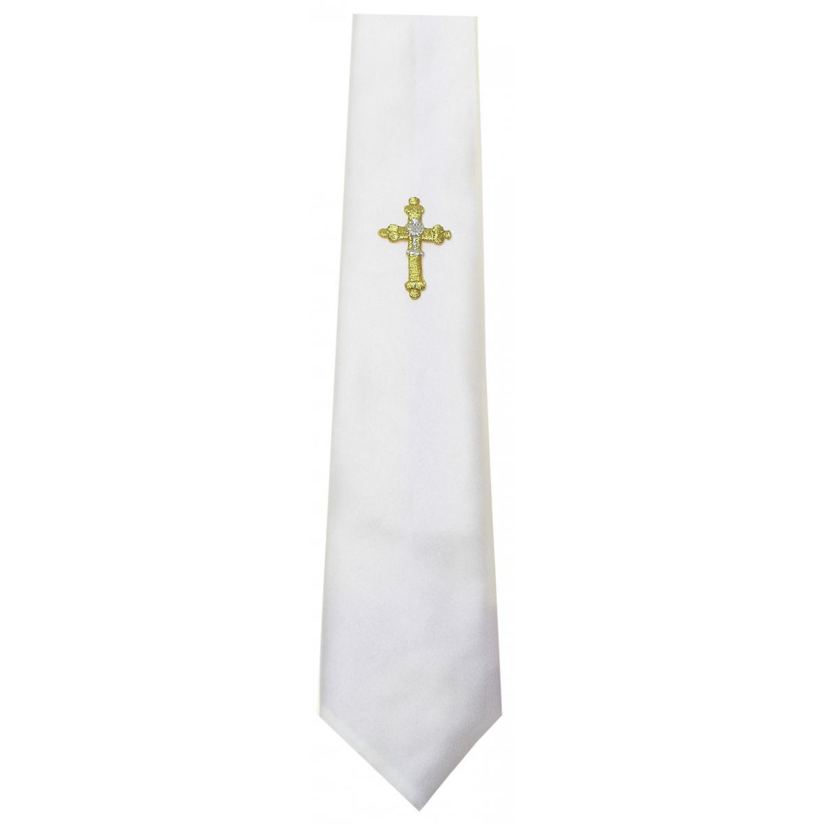 Boys white communion tie decorated with a gold cross and a silver chalice in the centre of the cross.