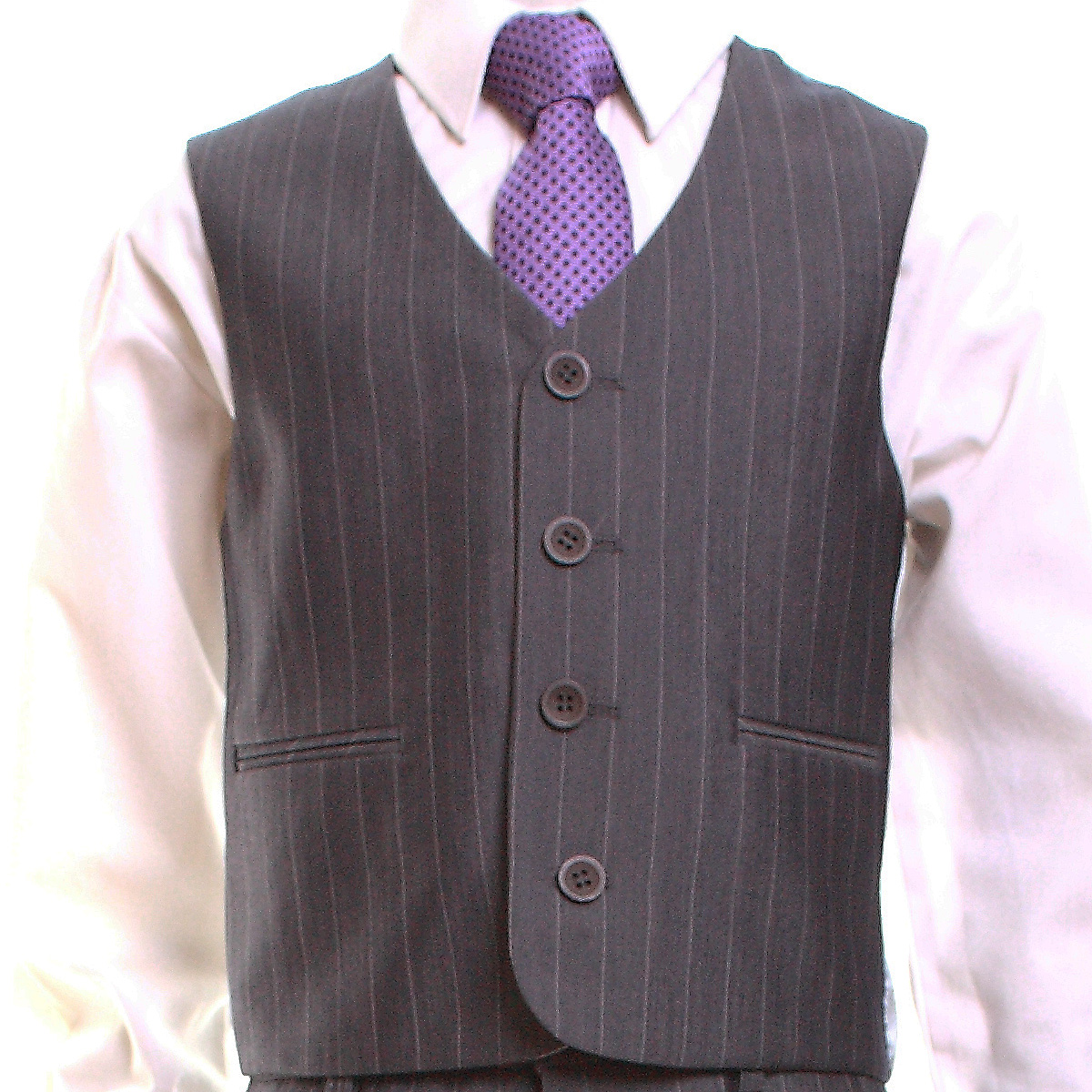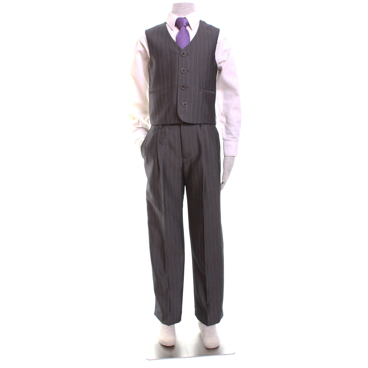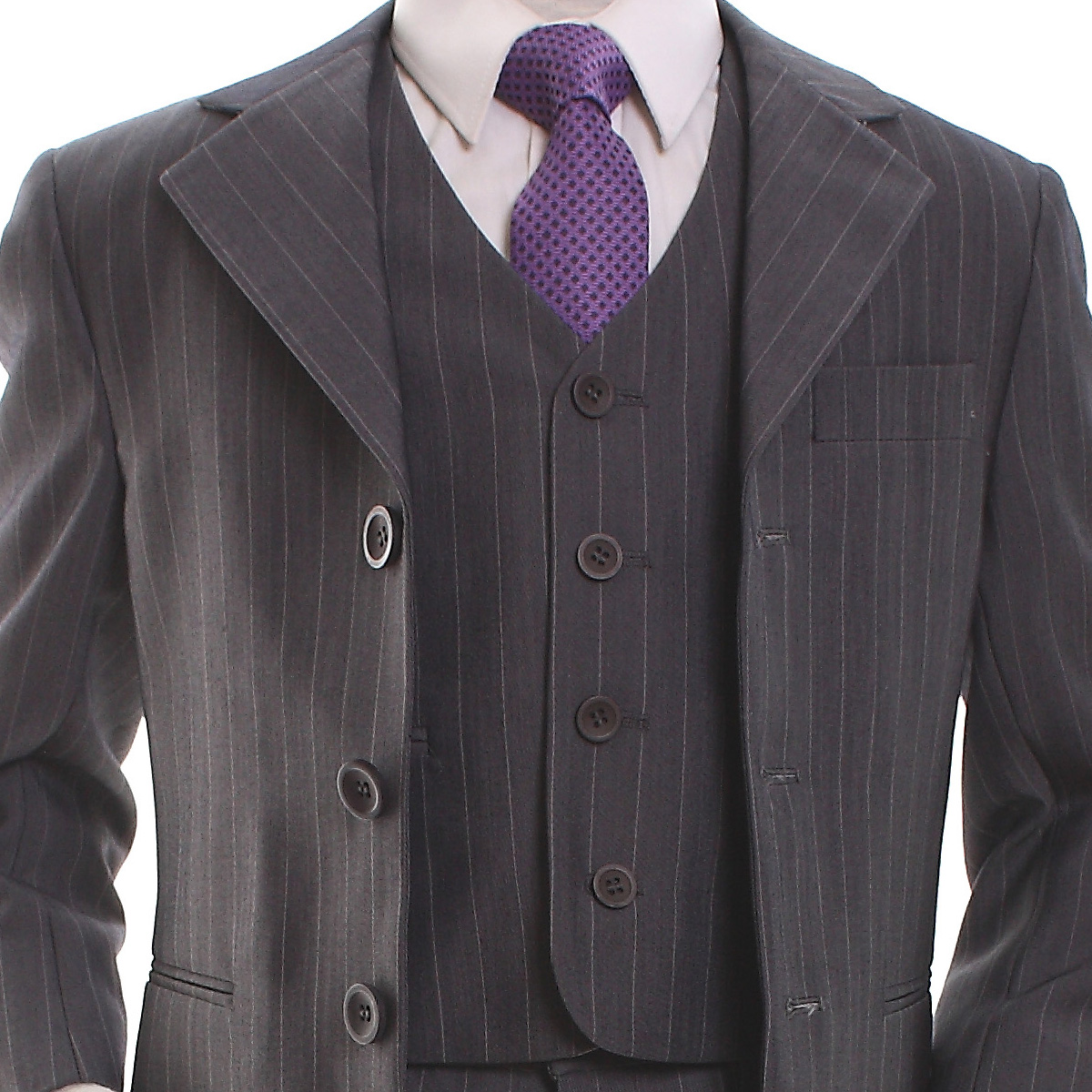 Smart looking grey colour suit made with very high quality material and superb cut. The pinsdtripe is fine and subtle. This boys grey suit set comprises:
