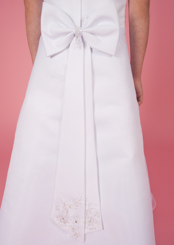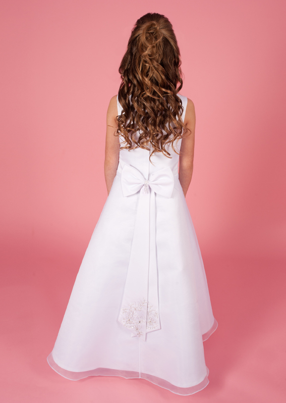 White communion dress beaded lace & pleat organza bodice. Decorated by beads. Fully lined. Made by Linzi Jay.