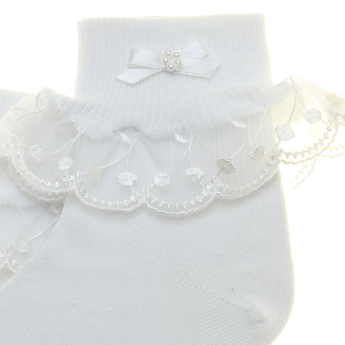 Frilly white socks with cherry lace decoration. Finish with a bow and beads forming the daisy pattern. Sizes indicated are UK children shoes size (not age).