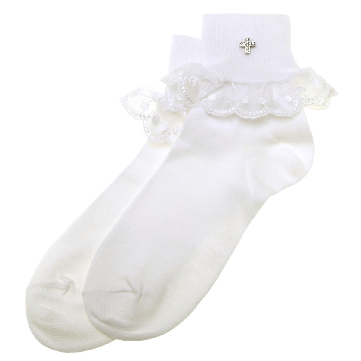 White cherry lace socks decorated with a silver cross with diamantes. Sizes indicated are UK shoes size (not age).