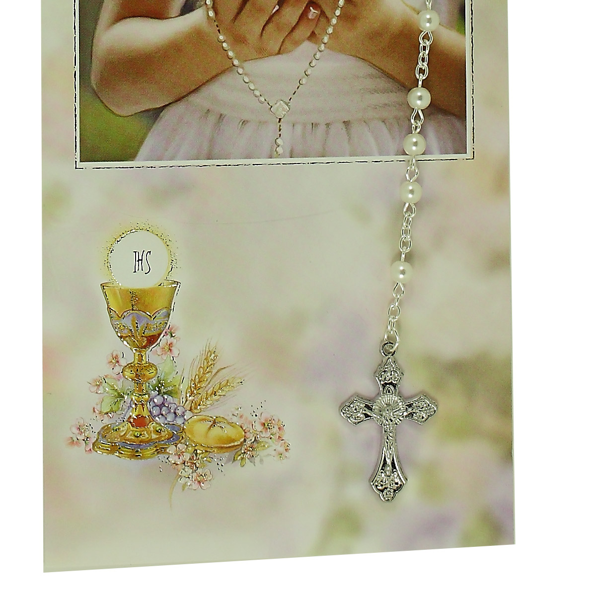 Lovely card that comes with an imitation pearl rosary for your dear granddaughter