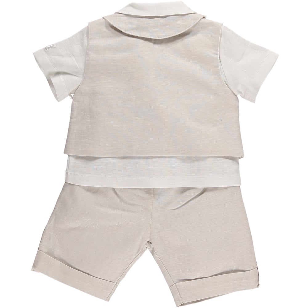 Look great for christening, naming and special occasion with this boys smart waistcoat set. This boys outfit comes in an ivory shirt, beige colour waistcoat, shorts and cap.