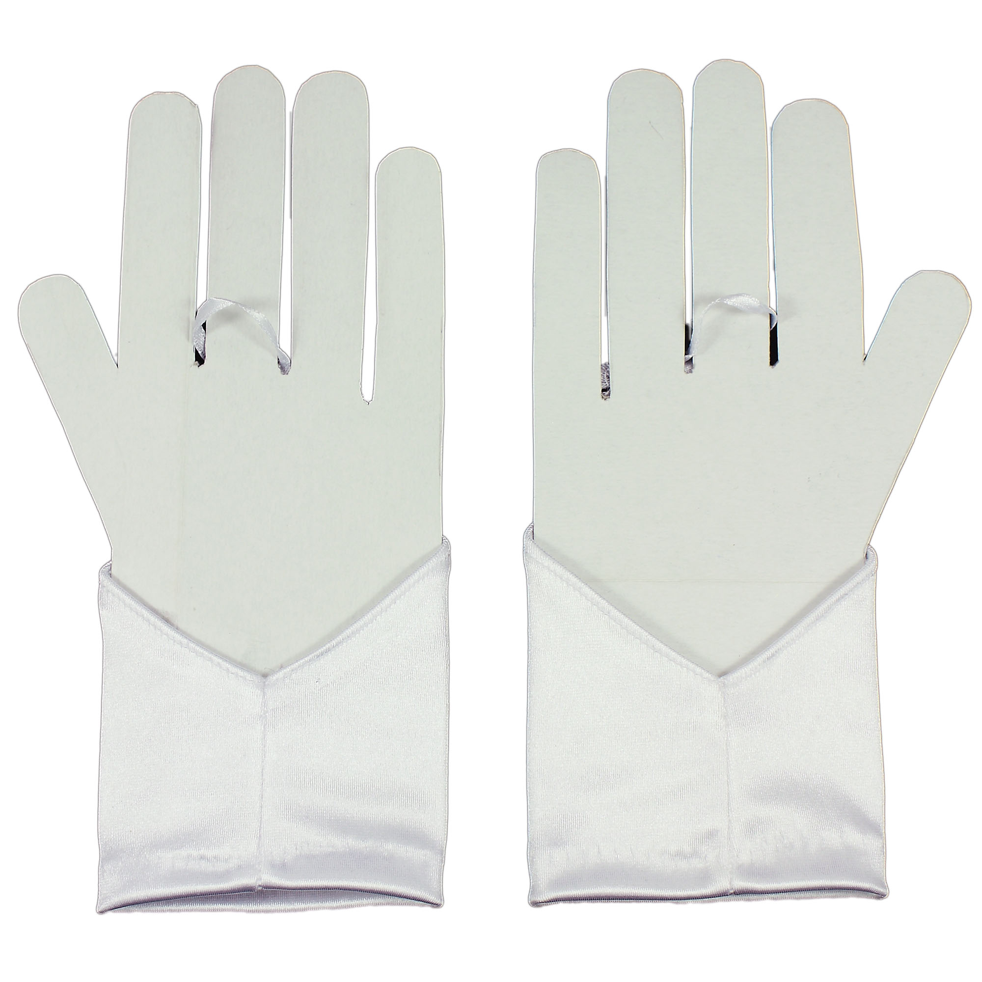 White satin fingerless First Holy Communion gloves decorated by lace and flower petals. Suitable for 7-12 years old. Wrist length. About 5.5".