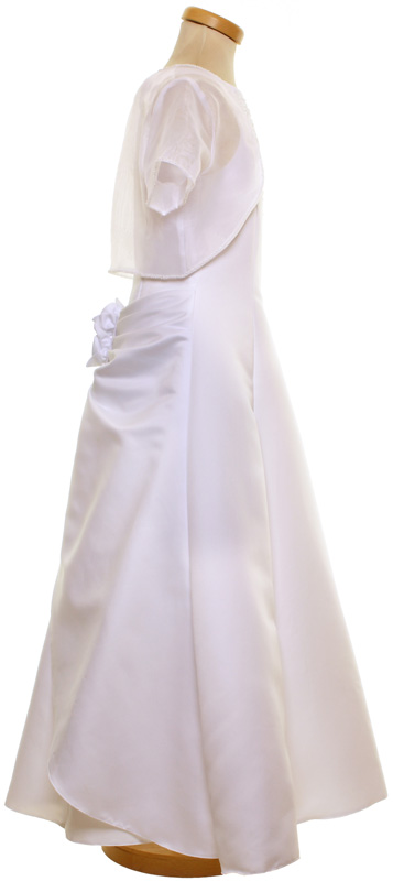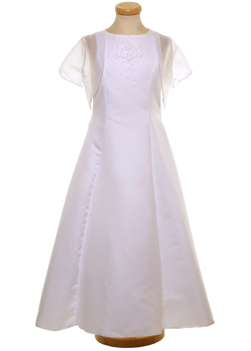 • comes with a net material communion bolero that has beads on the trim and sleeves.