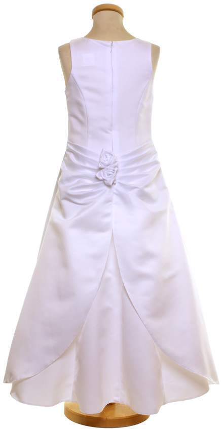 • back of dress is gathered around waist, complete with 2 large white flowers