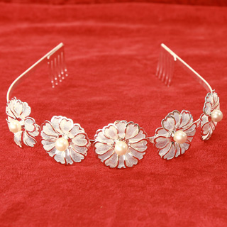 Pretty silver colour communion Alice Band / Tiara decorated with flowers and pearl shapes. End combs for attaching to hairs securely. This will made a nice communion headdress for the little girl on her most important day.
