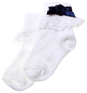 Frilly lace cotton rich girl white socks with navy rosebud and bow