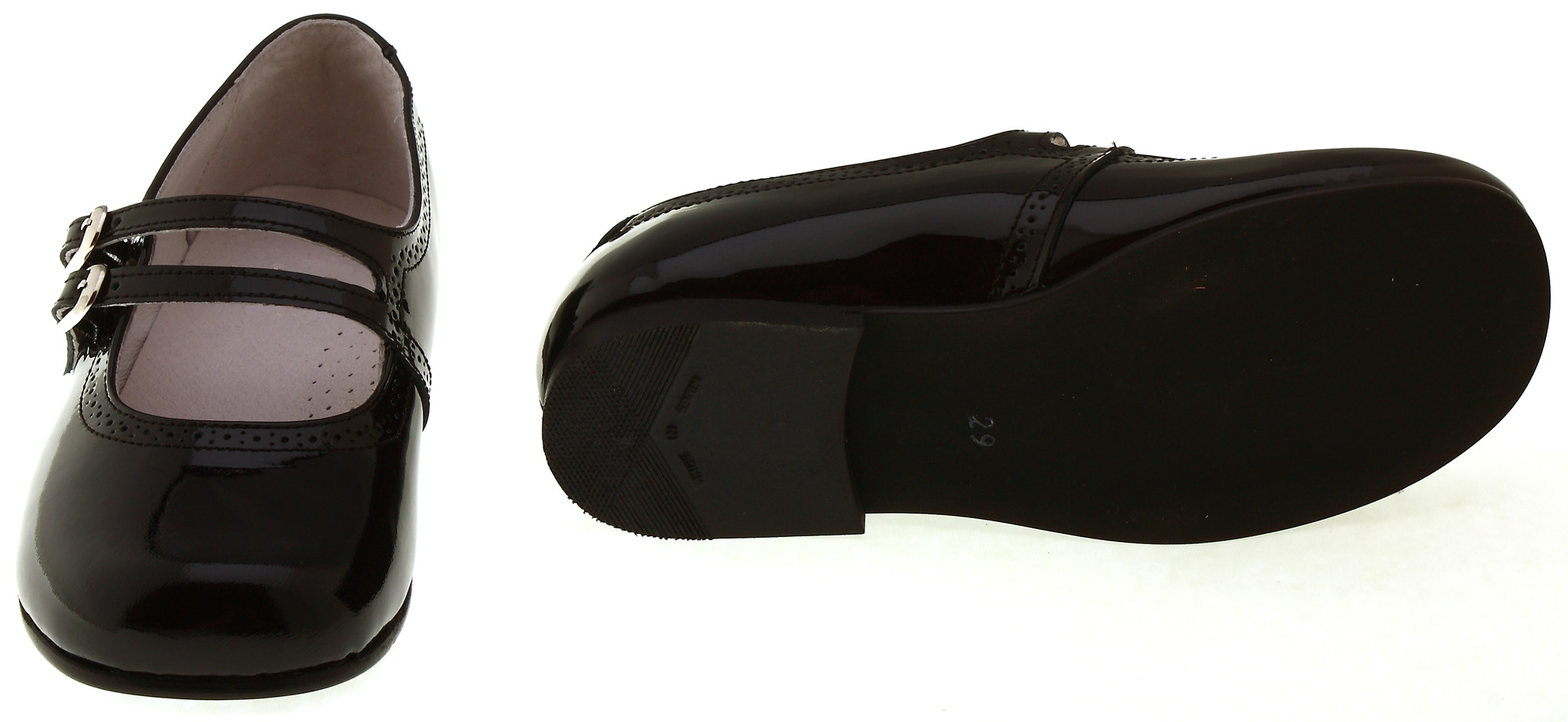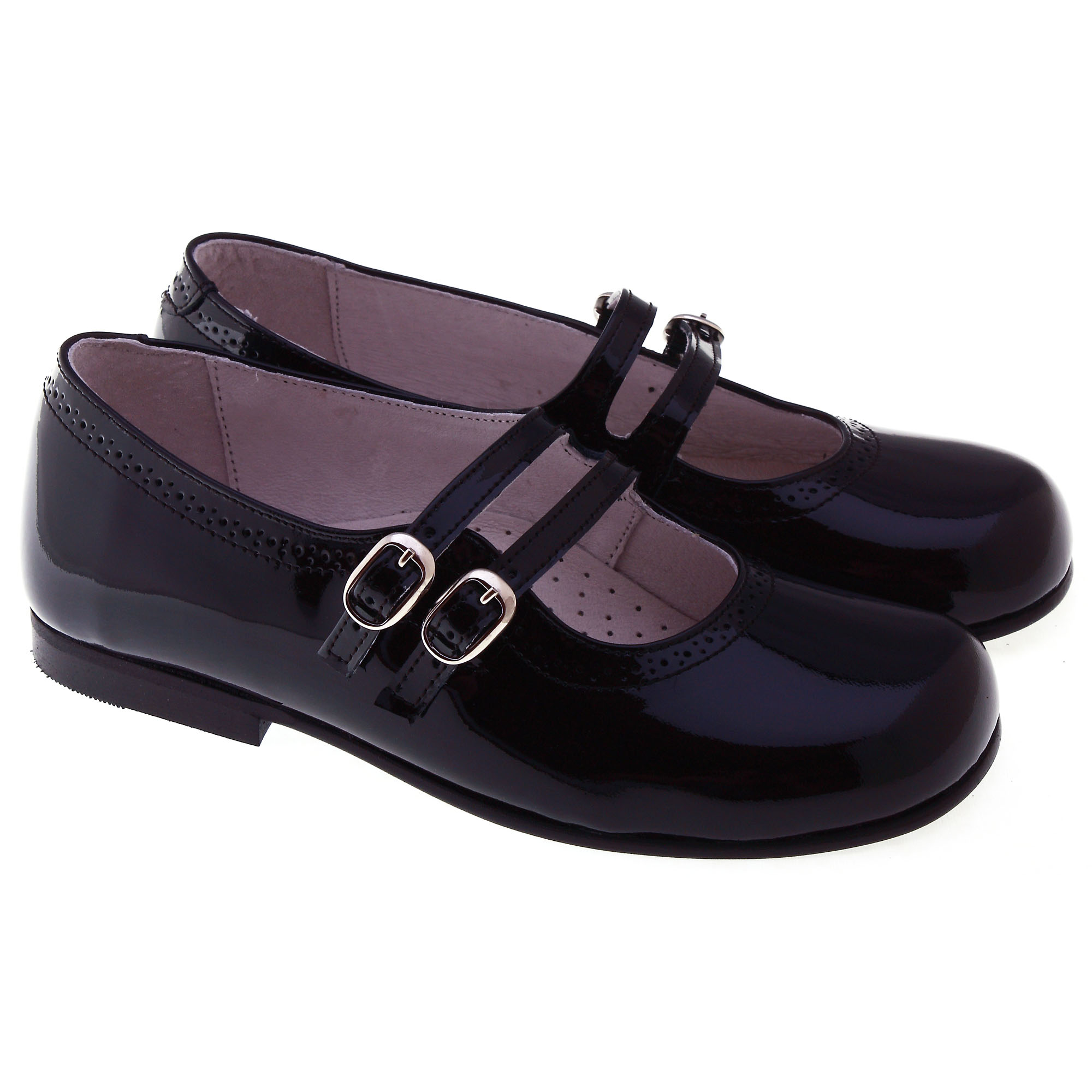 Mary Jane styled girls navy patent leather shoes with double straps: