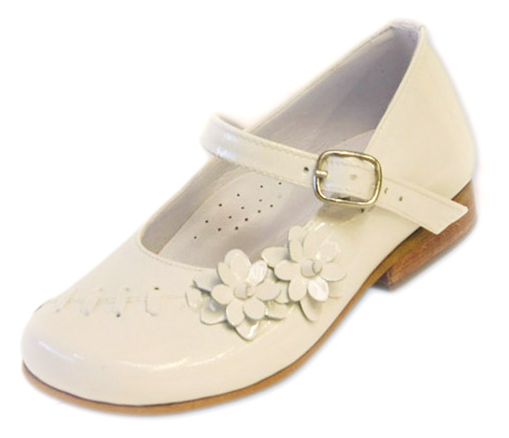 Girls leather shoes with two leather flowers. 100% leather. Made by Pretty Originals in Pink. Picture in white which is sold out.