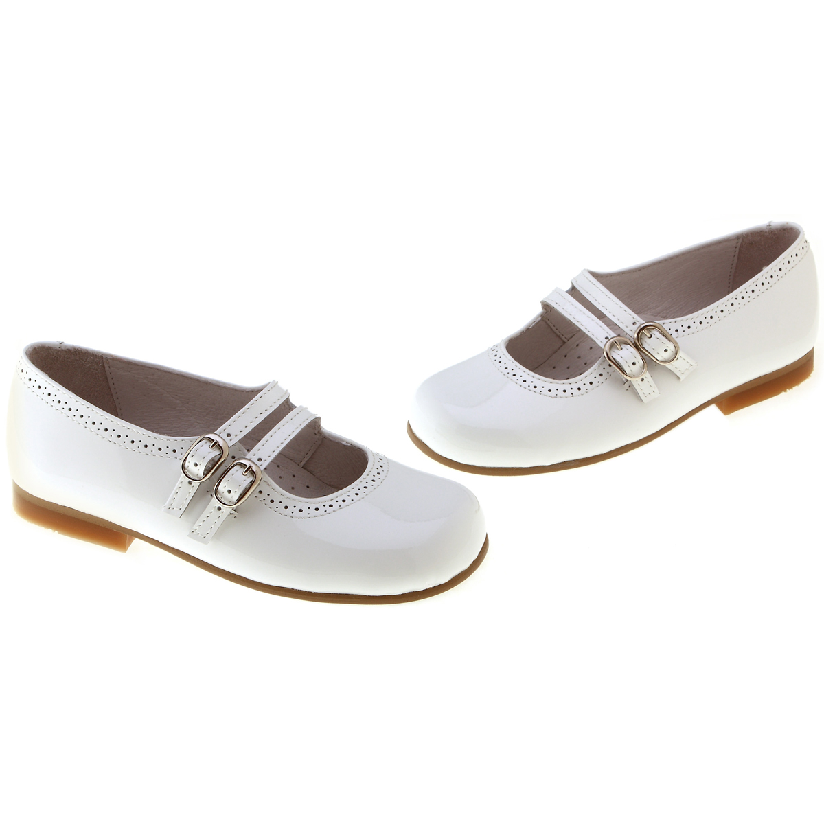 These unique looking shoes are made of white patent leather and fastened with two straps buckles (only need to undo one strap to put on or take off):