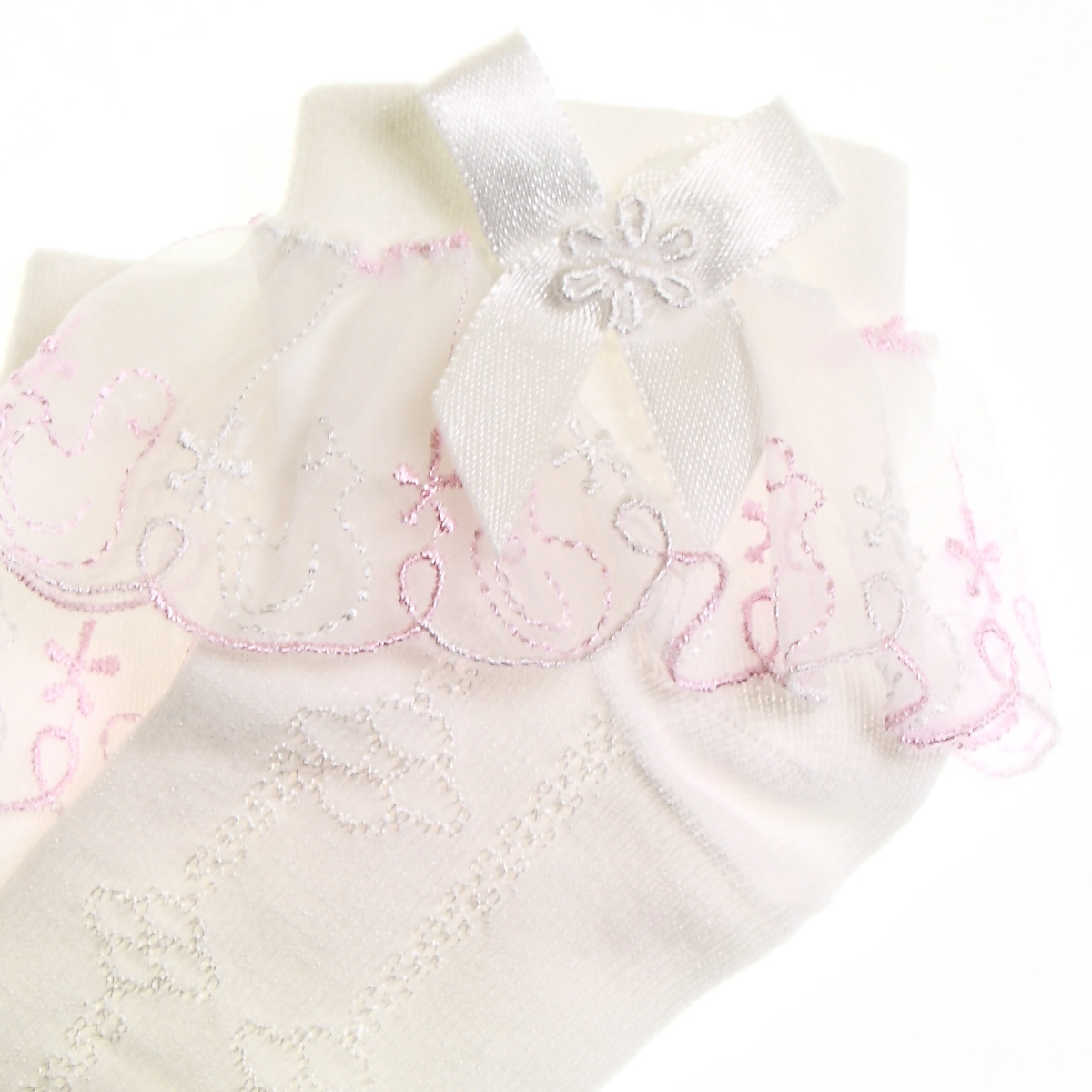 Extremly soft and comfortable off-white socks in a high cotton content quality for babies girls and older girls. Frilly socks decorated with duck patterns (on frills) and bow