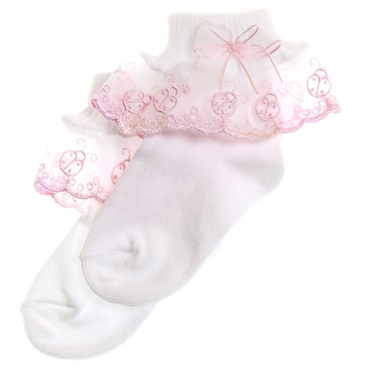 Girls white frilly socks in cotton rich, trim is decorated with ladybird patterns and bow