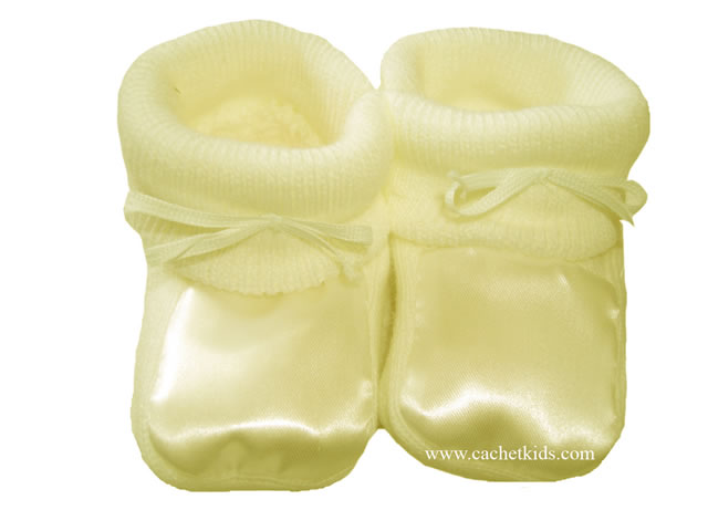 Unisex baby soft booties for newborn baby boy and girls. Ivory / cream colour. Length 3"/7.5cm. Knitted with satin top. 100% acrylic. For newborn babies.