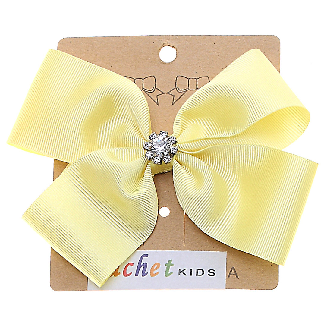 Very pretty yellow lemon colour large gros grain ribbon bow with a glittery flower petal diamantes in the centre. Crocodile clip. Size 11cm x 11cm (4.5 inches x 4.5 inches). Suitable from 2 years onward. Contain small parts. Use on small child only under supervision.