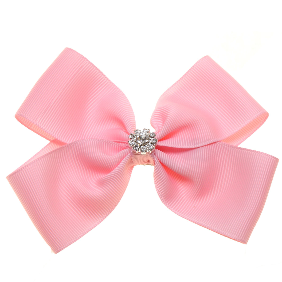 A large gros grain pink ribbon with a glittery flower petal diamantes in the centre. Crocodile clip. Size 11cm x 11cm (4.5 inches x 4.5 inches). Very nice. Suitable from 2 years onward.