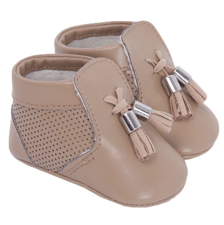 Nice and comfortable baby boys light caramel pram shoes in bootee style. Made from leatherette. Soft interior and sole. Decorated by tassels.
