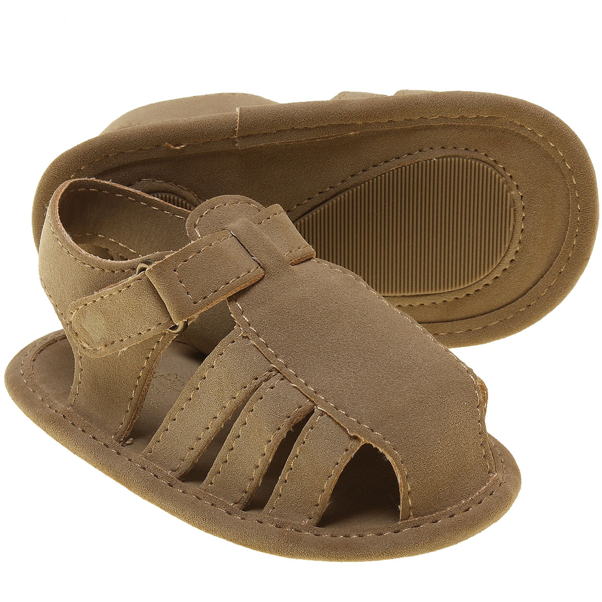 Traditional baby sandals in caramel brown colour ideal for hot summer days. Made from Faux leather. Suitable for both baby boys and baby girls. These are soft bottom pram shoes. Faux leather is artificial leather made from a fabric base.