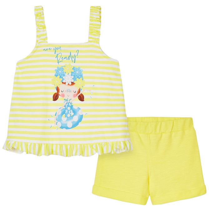 100% cotton great for Easter and hot summer Mayoral Girls Spring Summer lemon yellow white sleeveless stripes top with yellow shorts set: