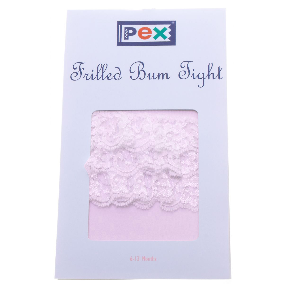 Baby girls pink tights with frilly bum. About 30 denier. 84% nylon, 16% spandex. Made by PEX. Also available in white and ivory.