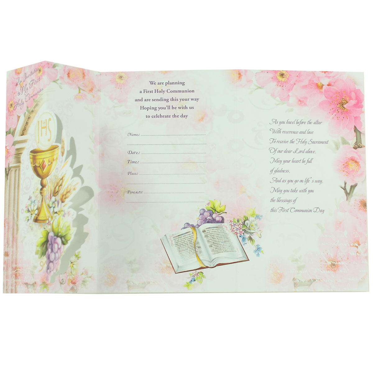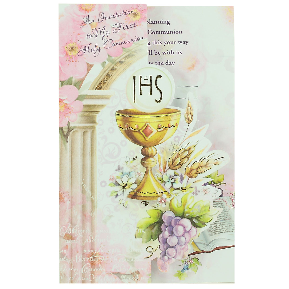 Very pretty communion invite cards that come in a pack of 12.  The cards have: