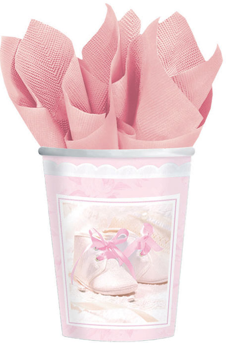 Pink paper cups. Pink floral printed background cup with white booties that have pink laces in squares. Coordinate with the rest of the tableware range. 8 cups per pack.