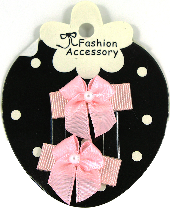 A pair of pink bow with snap clips that is especially designed for baby with little or fine hairs. Decorated with a centre bead. Bead is sewn on (not glued on).