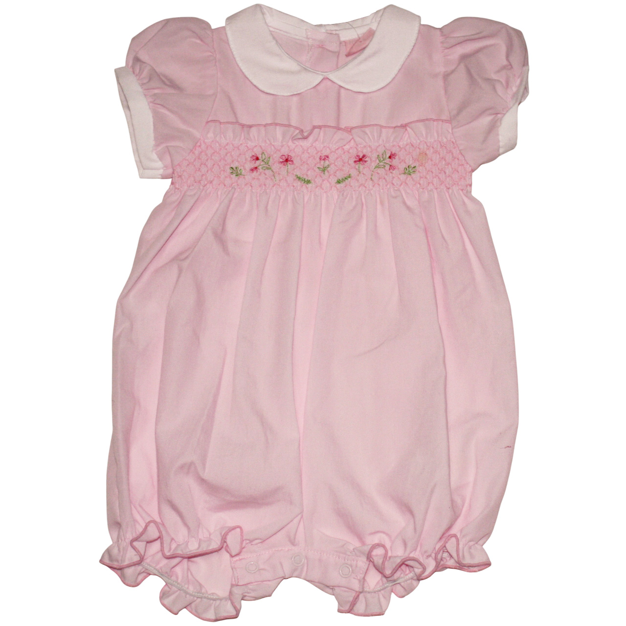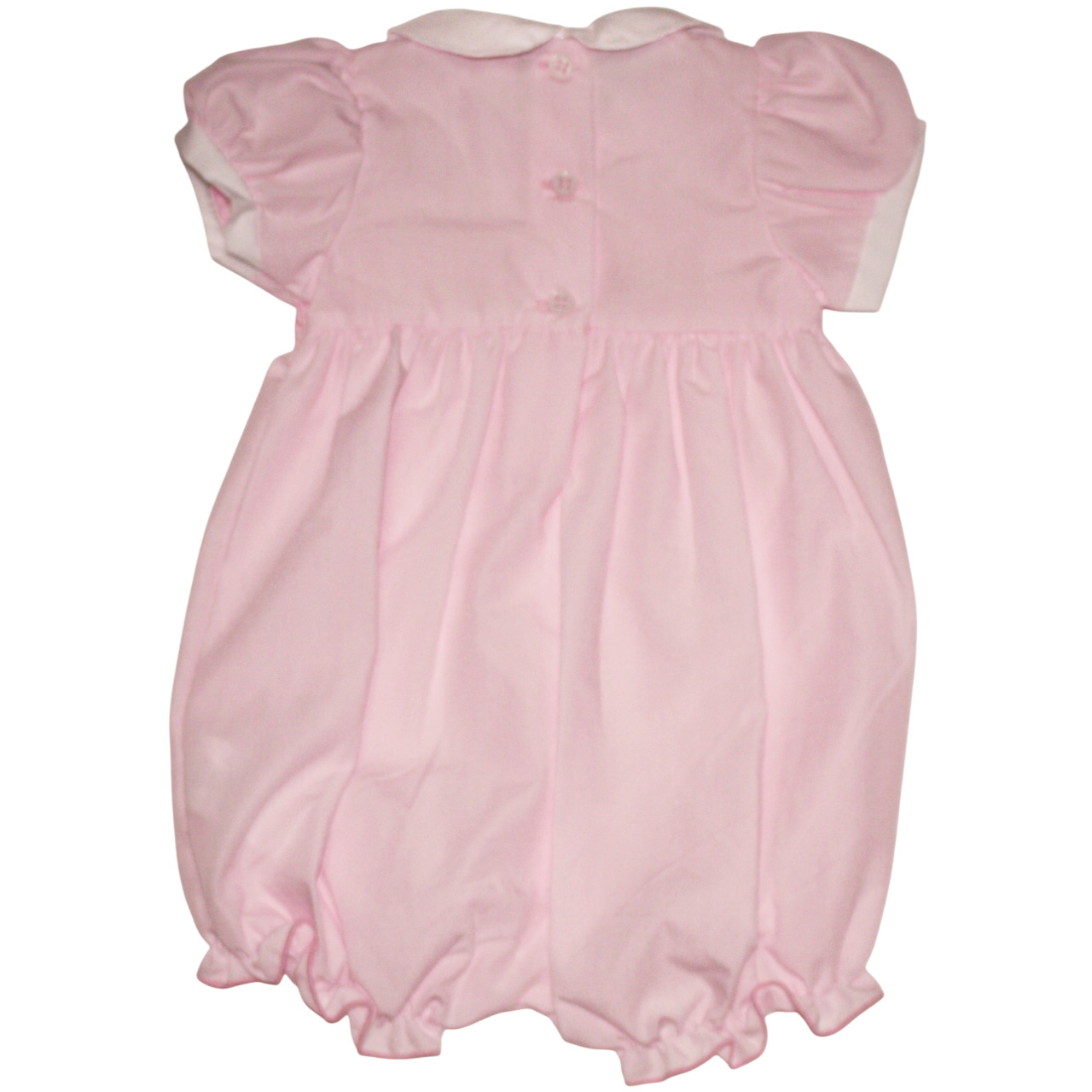 Light pink romper for baby girls good for spring summer. Smocked and embroidered on chest. Buttons at the back and groin. 80% polyester 20% cotton.
