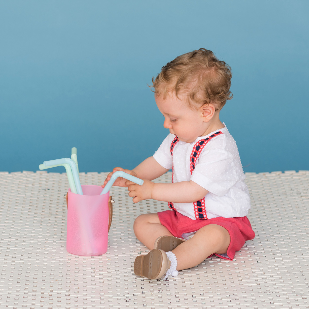 From the Spring Summer Spanish Deisgn Baby Boys Collection, this baby boys outfit has a white top and a coral red shorts. The shirt is decorated by coral red scallop lace with navy ribbon. The shirt can be buttoned to the shorts. The shorts are fully lined.