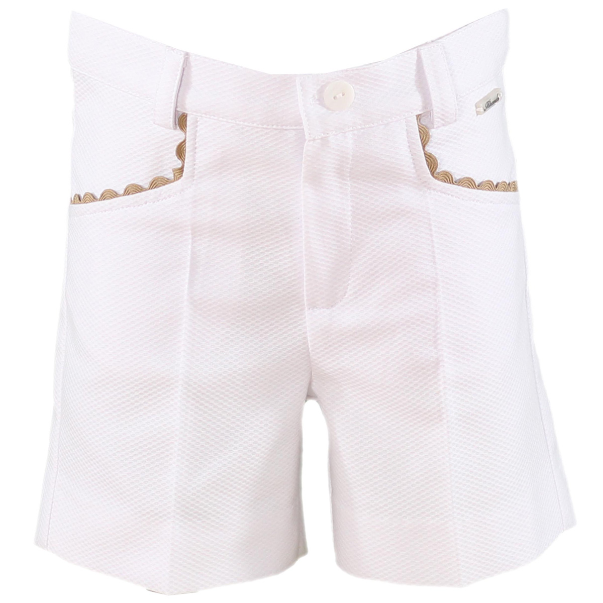 Ideal for spring and cool summer is this boys outfit from Spanish brand Miranda, The shirt is in light caramel brown and white gingham pattern. The shorts are white with two side pockets and decorated by caramel scallop lace.
