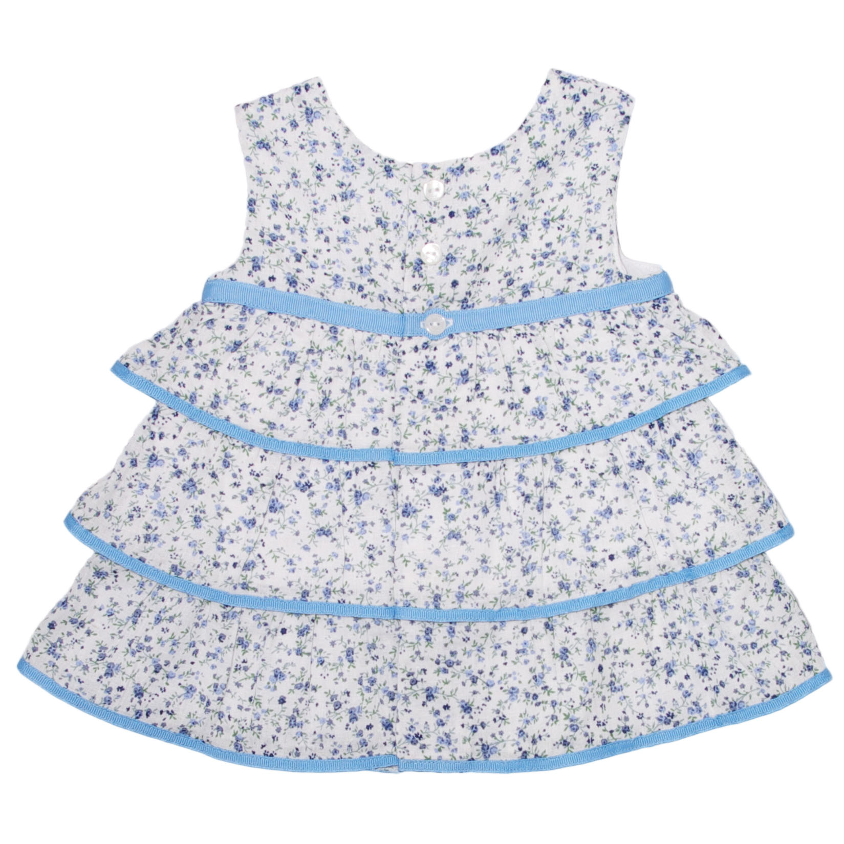 Gorgeous soft blue layered dress. Decorated by blueberry print, blue trim and a bow. Buttoned at rear. Fully lined. Made by Spanish brand Tutto Piccolo.