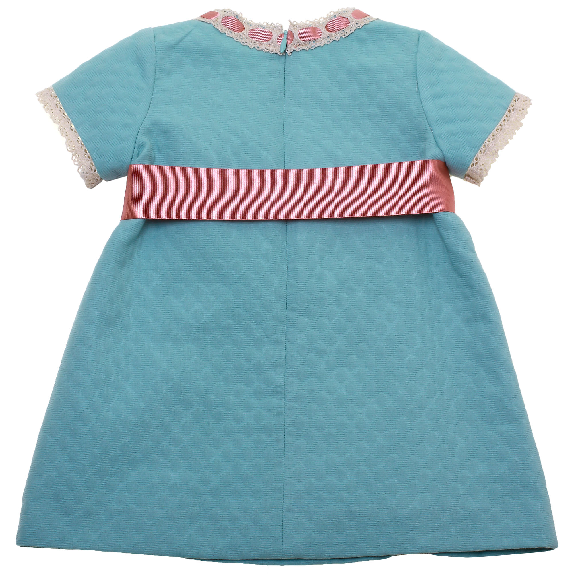 Very pretty turquoise green summer dress made by Spanish brand Tartaleta. Decorated by brown lace and dusky pink bow. Zipped at rear. Fully lined. Made in Spain. This is one of the most pretty dresses from Tartaleta.