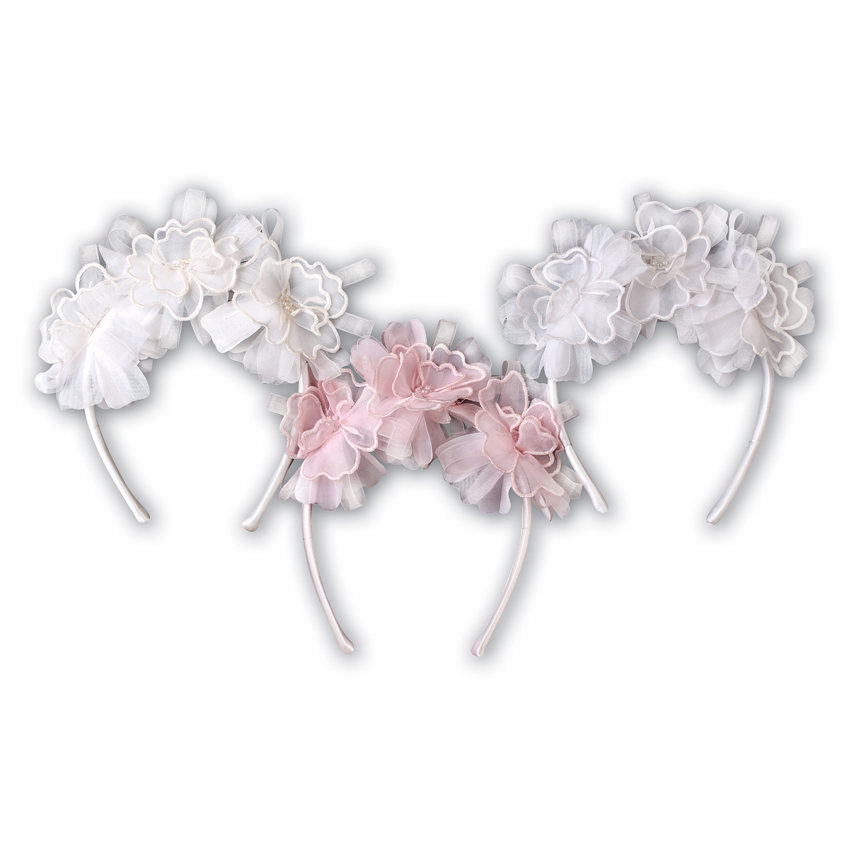 Sarah Louise alice band available in ivory, pink and white.  Decorated by 3 flowers made in fabric. Price per alice band.