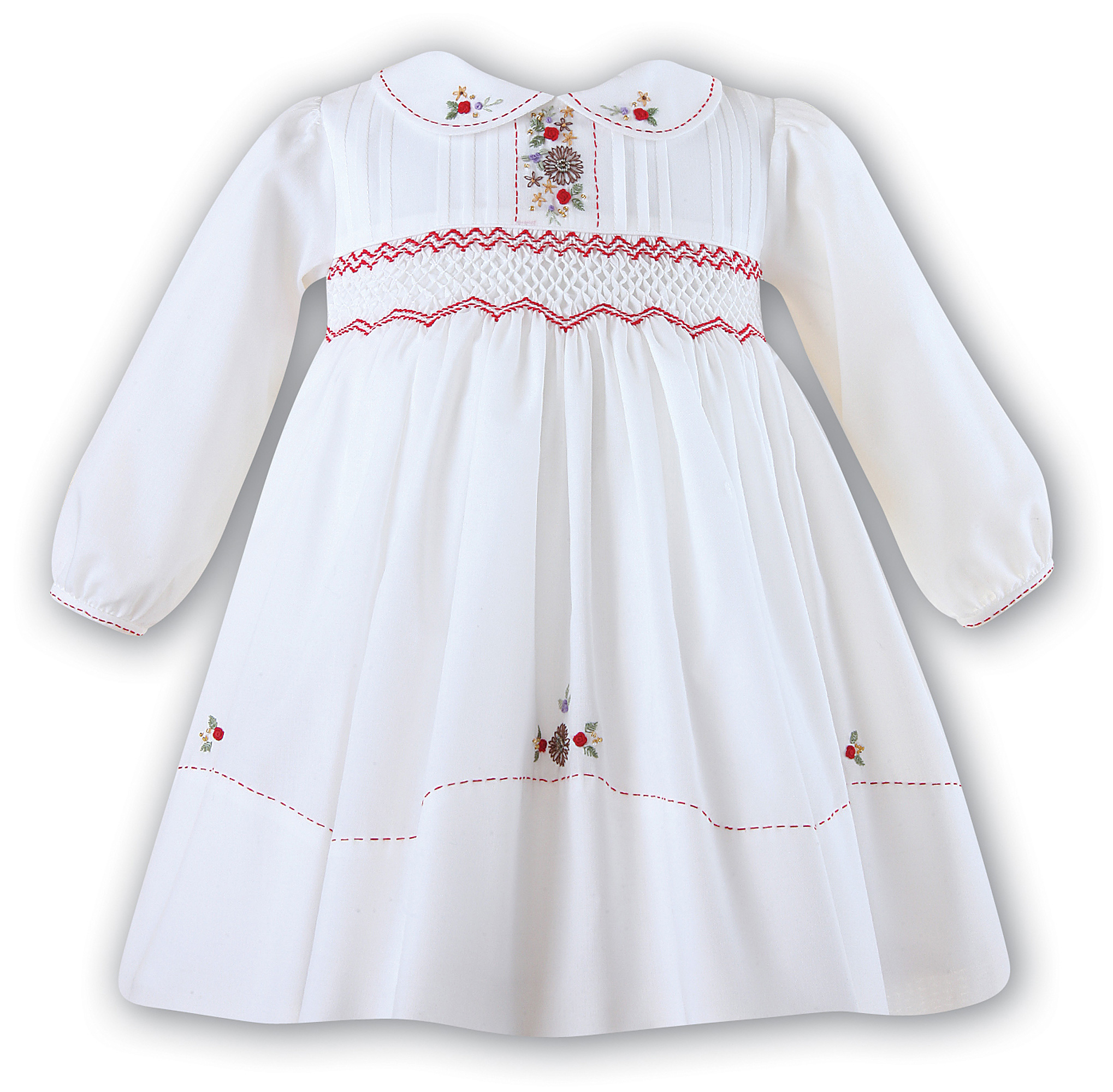 Girl smocked dress in ivory / off white with red embroideries by Sarah Louise. Fully lined and machine washable.