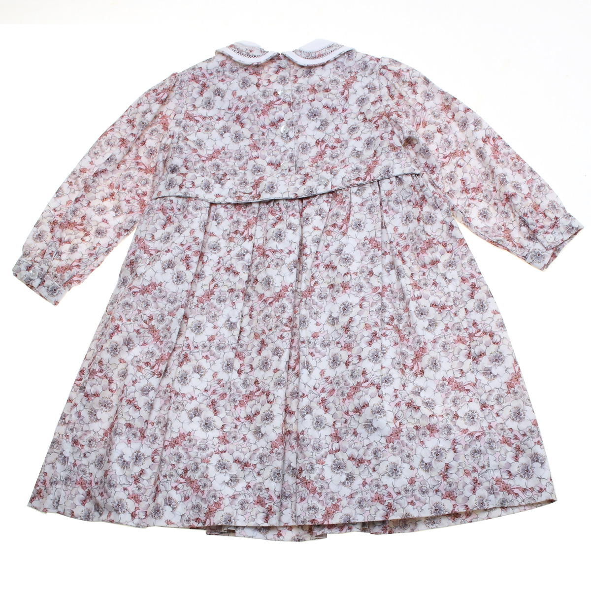 Sarah Louise small pink floral pattern fabric dress with heavy smocked across the chest. Pattern on collar.