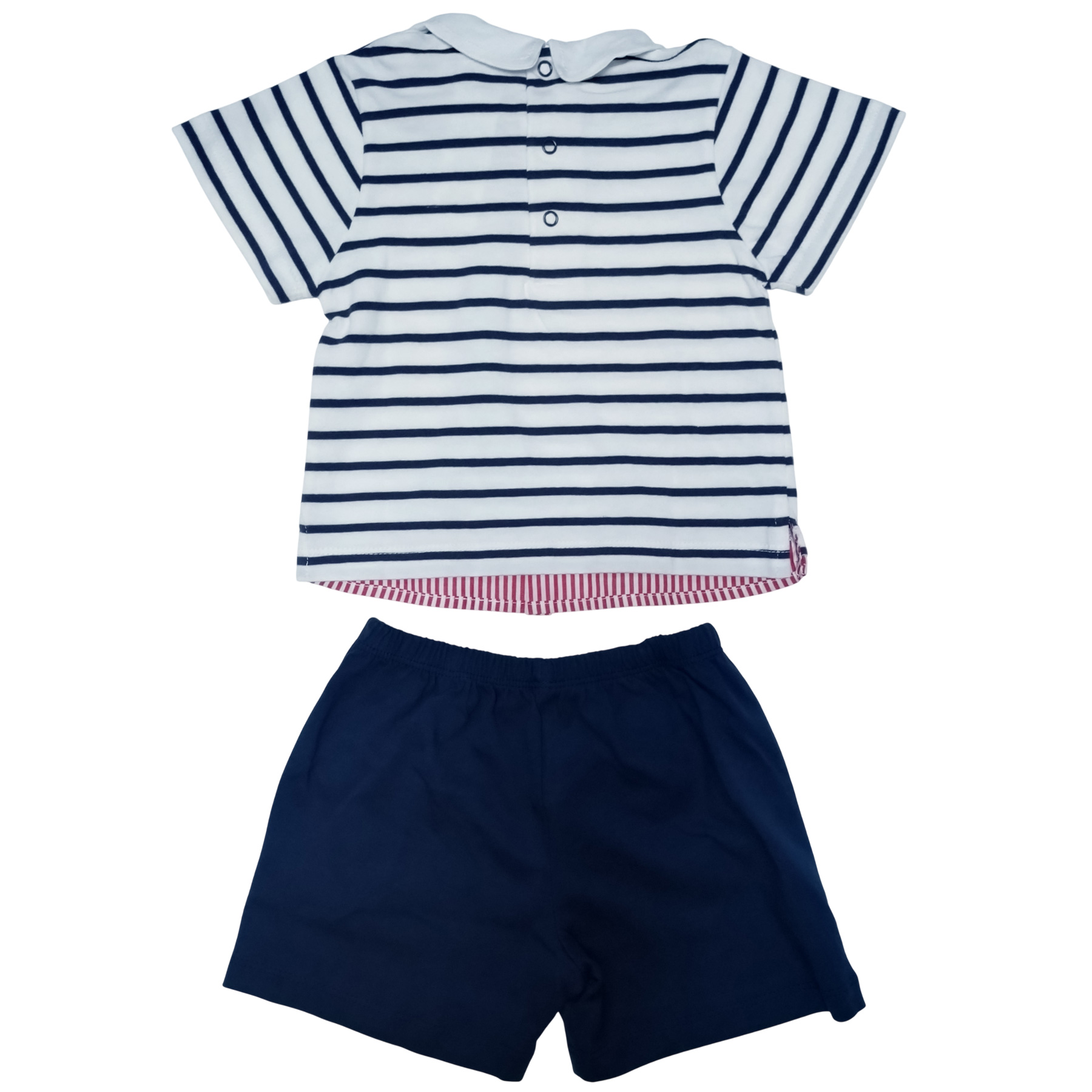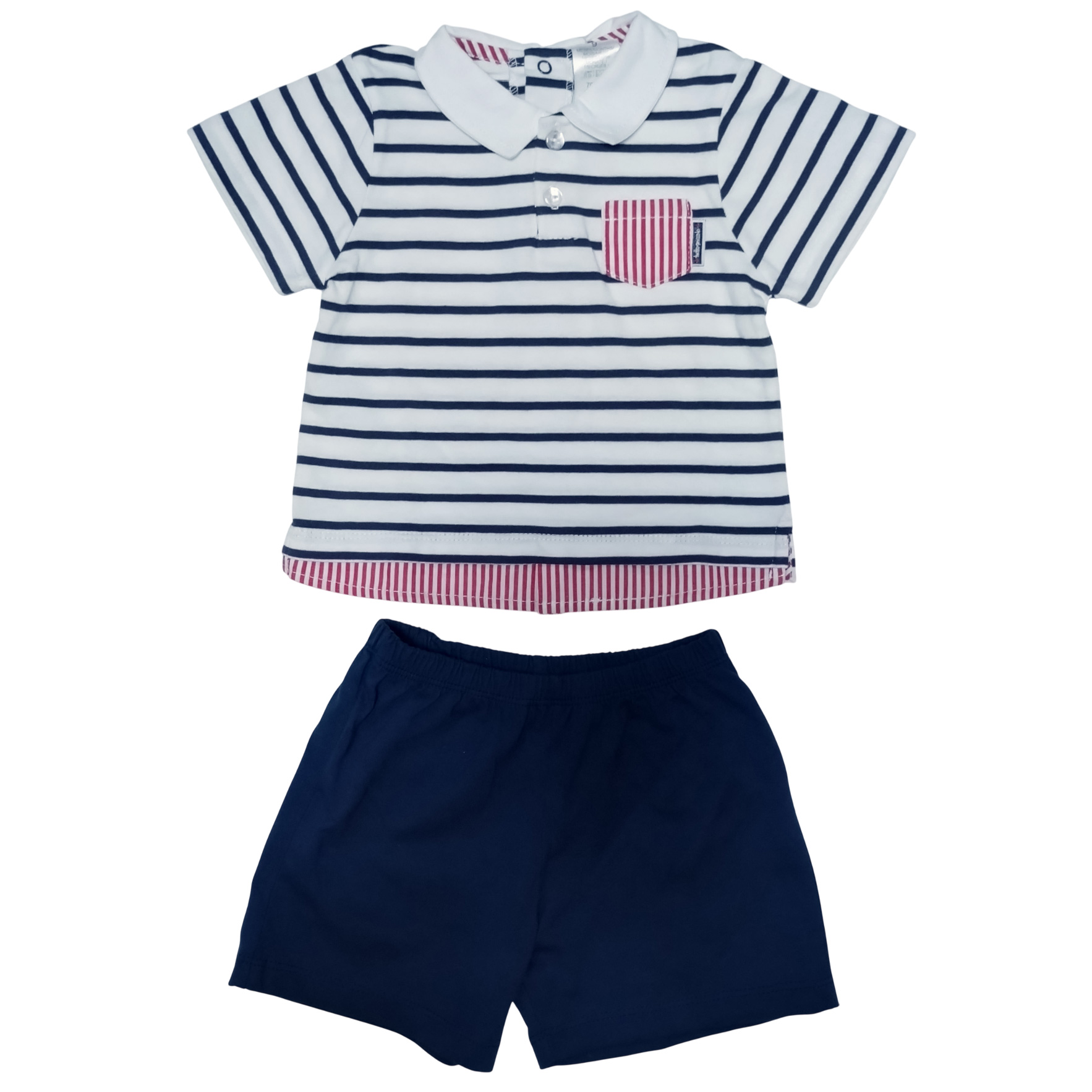 Soft and comfy baby and toddler boys 2 piece set. Top has Peter Pan collar, decorated by a red stripes pocket and red stripes trim. Bottom has elasticated waist. Made by Spanish Tutto Piccolo.