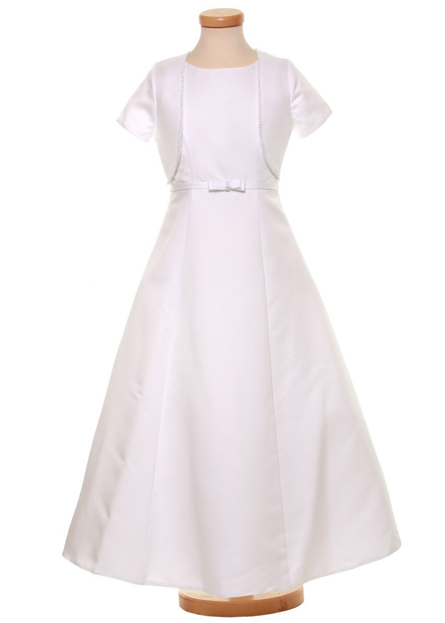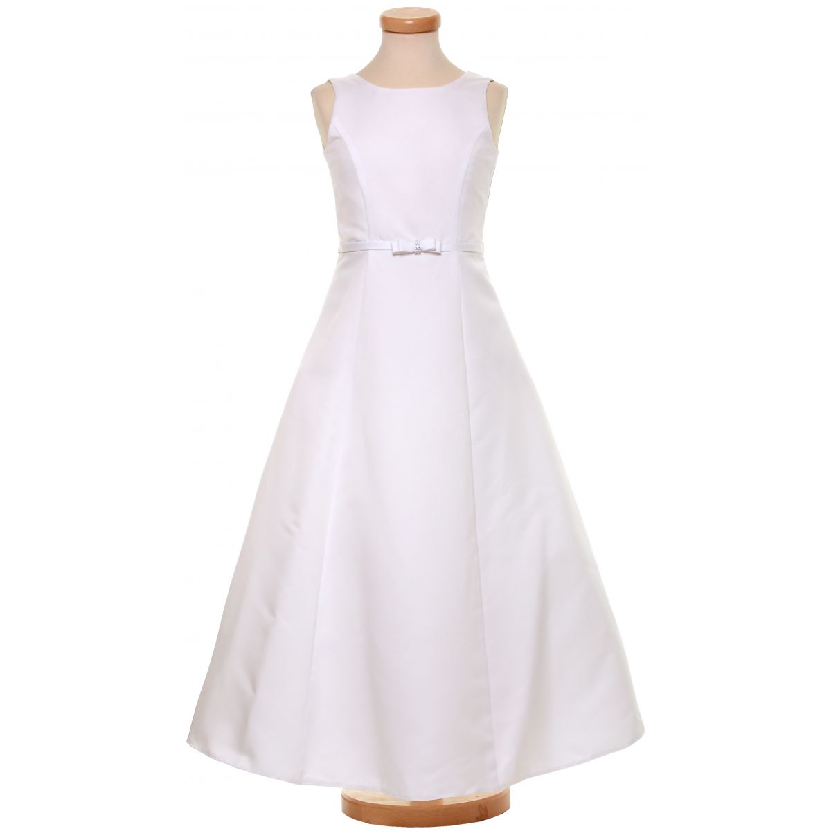 An elegantly simple but beautifully designed communion dress that is decorated with a bow and diamantes in front:
