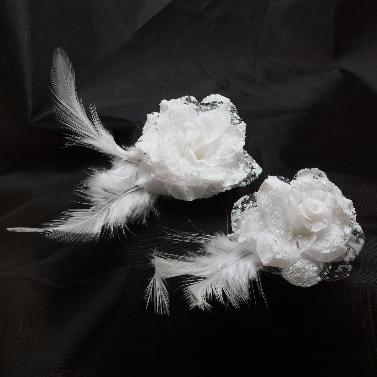 White flowers with feather head clips for use in communion, confirmation and special occasions.